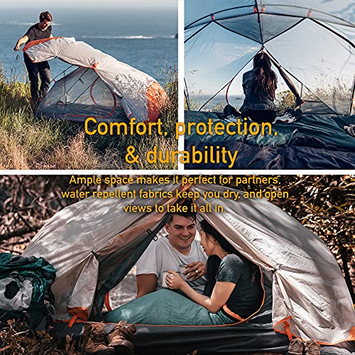 2-PERSON: This backpacking tent is spacious enough to accommodate up to two people, perfect for couples. Conveniently built with two doors and two vestibules that provide great amount of storage space for your camping gear.