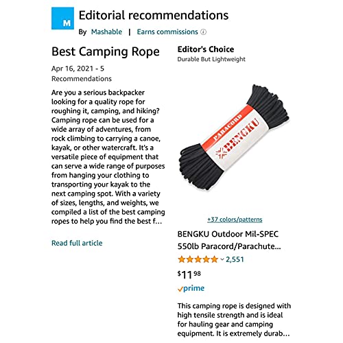 Specification: BENGKU Outdoor Mil-SPEC 550lb Paracord/Parachute Cord(MIl-C-5040-H), 50 feet, 100 feet