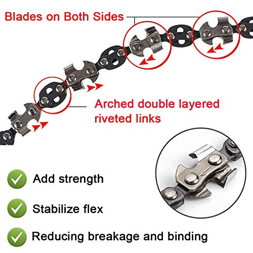 Upgraded 68 teeth: 68 Sharpest Carbon Steel Teeth. The High Limb Saw has an Upgraded 53 Inch Chain with Blades on BOTH sides. Arched double layered riveted links add strength to connecting chain and stabilize flex, reducing breakage and binding.