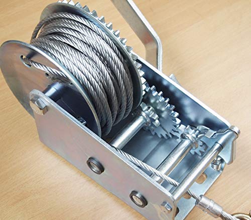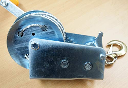 Ideal for ATV/UTV, Boats, Trailer, Shipping, Transport, Workshop, and more. This Winch is NOT to be used to Lift or Move People. Features: Can be used for pull and lift loads Heavy Duty Zinc Plated Metal Construction. Positive action brake can hold the load in any position. High commonality, easy to move. Rated Pull: 2000LBS (900KG). Steel Cable:3/16″(4.8mm) Diameter x 33′(10 Meter) Long. Thickness of steel frame: 4.0mm. Hardened steel Gear Ration: 4:1 and 8:1. Drop Forged Hook: 3-7/8″ L, 1″ opening. Base Dimensions: 7″ L x 4″ W. Steel Handle Level Dimensions: 9″ x 1″ x 5mm. Length of Plastic Grip:4″ L. Overall Dimensions (without handle): 9″ x 6″ x 5″. Net Weight: 10LBS.